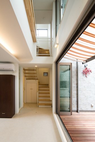 2階にメインのリビングと水廻りを配し、中庭を作って明るさと開放感とプライバシーを確保しました