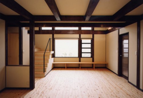 | [設計コメント] 「生まれ育った家を思い起こさせるような住まいにしたい!」というご主人の要望から生まれた、梁に色付けした古民家風のインテリアに生駒の景観を大切にしたプランです |