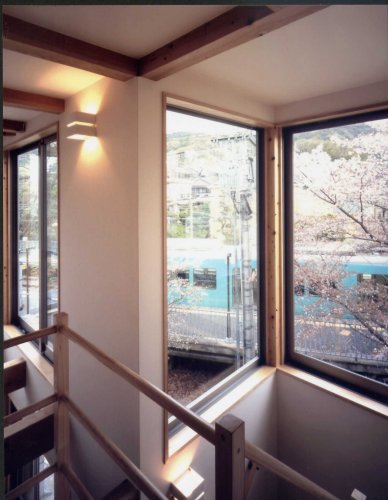 | [設計コメント] 川とプラットホームに挟まれた変形三角の敷地に建つ住まいです 駅横なのに自然と取り入れて別荘地の林の中にいるような気のする家です |